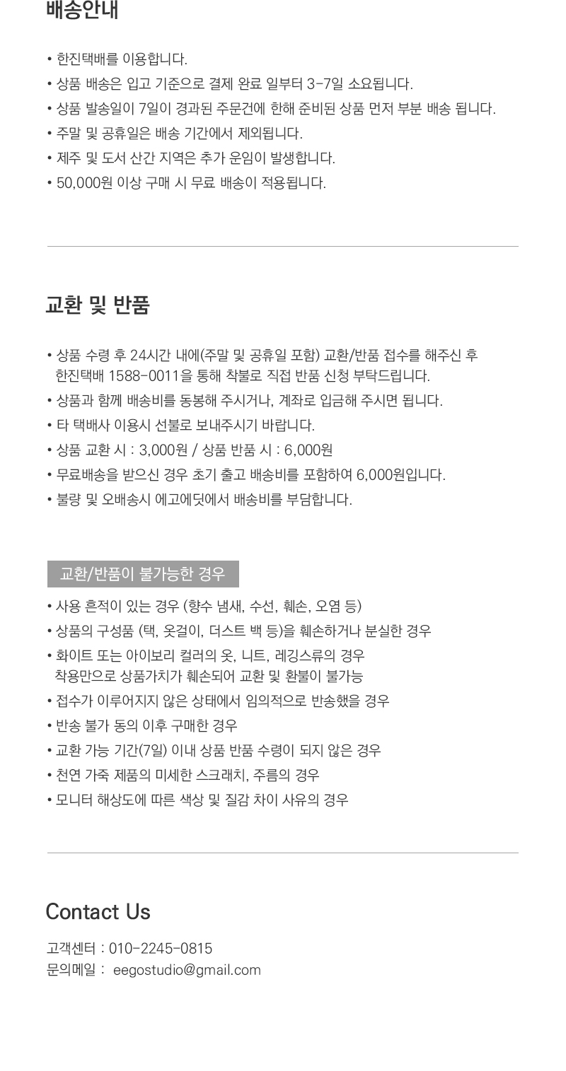 - 교환/반품 요청 이미지를 받으면 내부 검토 후 대표자가 개별적으로 후속 절차를 안내하도록 하겠습니다.