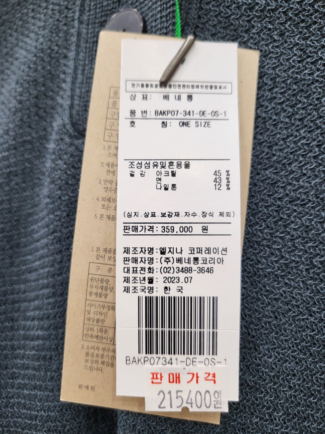 | 반품 주소 | 대전광역시 유성구 대정로 5 모다아울렛 1층 베네통 |